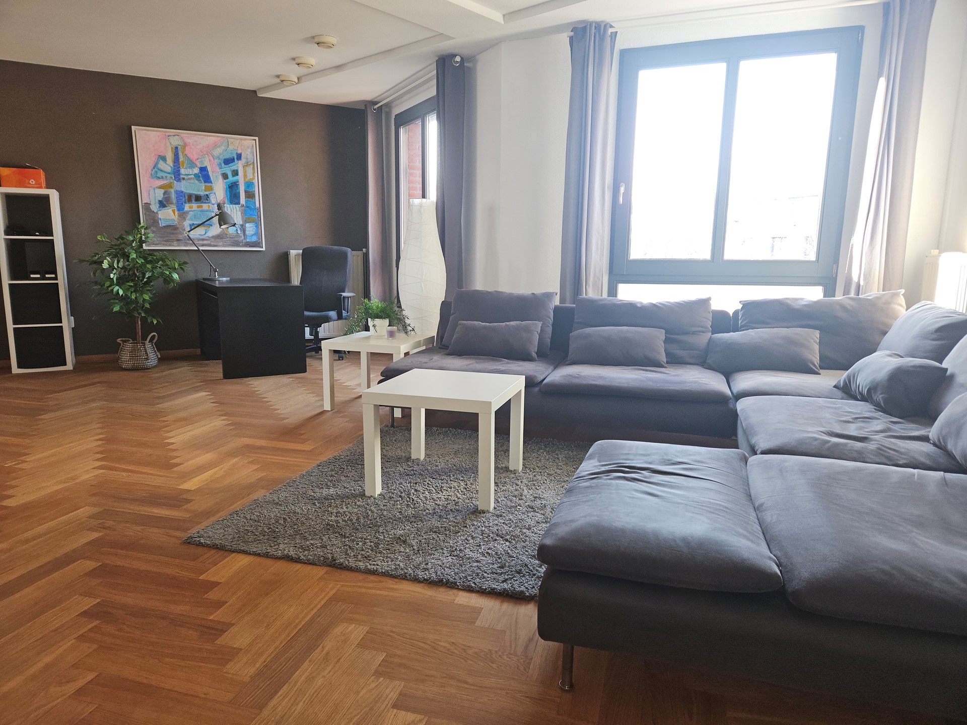 De zeer ruime L-vormige woonkamer (ca. 28 m2) is voorzien van een prachtige parket vloer.