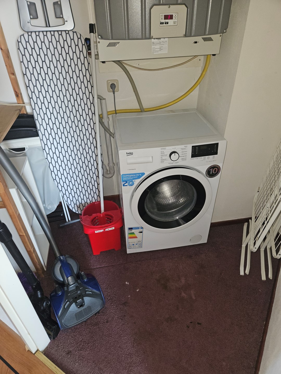 Vanuit de woonkeuken is de praktische bijkeuken met wasmachine- en droger-aansluiting en veel bergruimte.