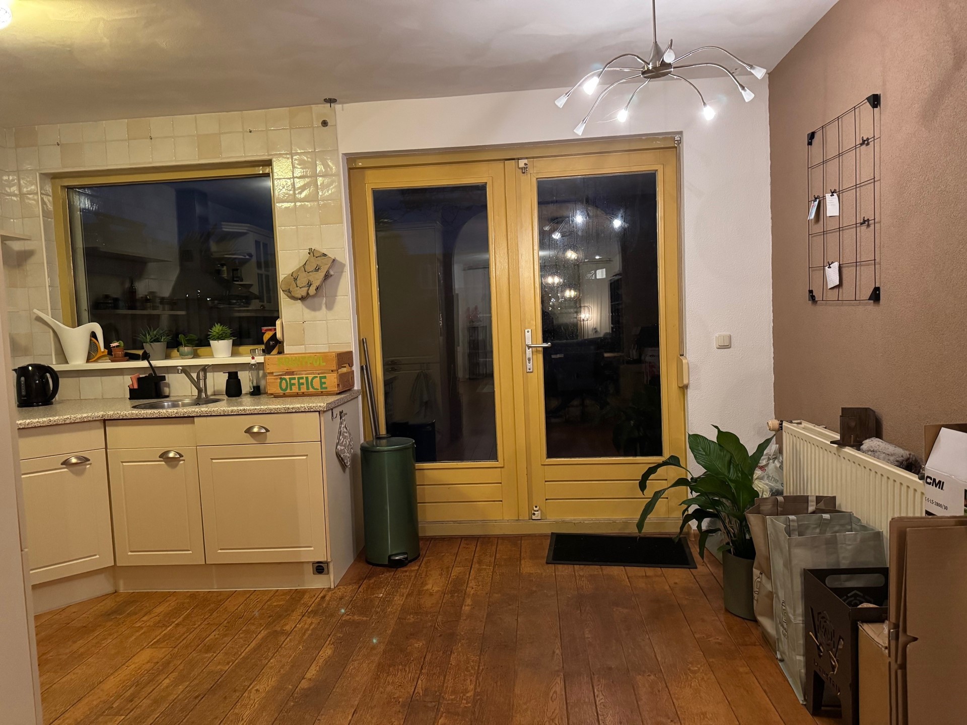 Ruime U-vormige keukenopstelling met de diverse apparatuur, t.w. 4-pits elektrisch fornuis, RVS afzuigkap, vaatwasser, koelkast en vriezer. Door de lichtkoepel is de woonkeuken heerlijk licht. Vanuit de open keuken heeft u –via de openslaande deuren- toegang tot de diepe achtertuin.
