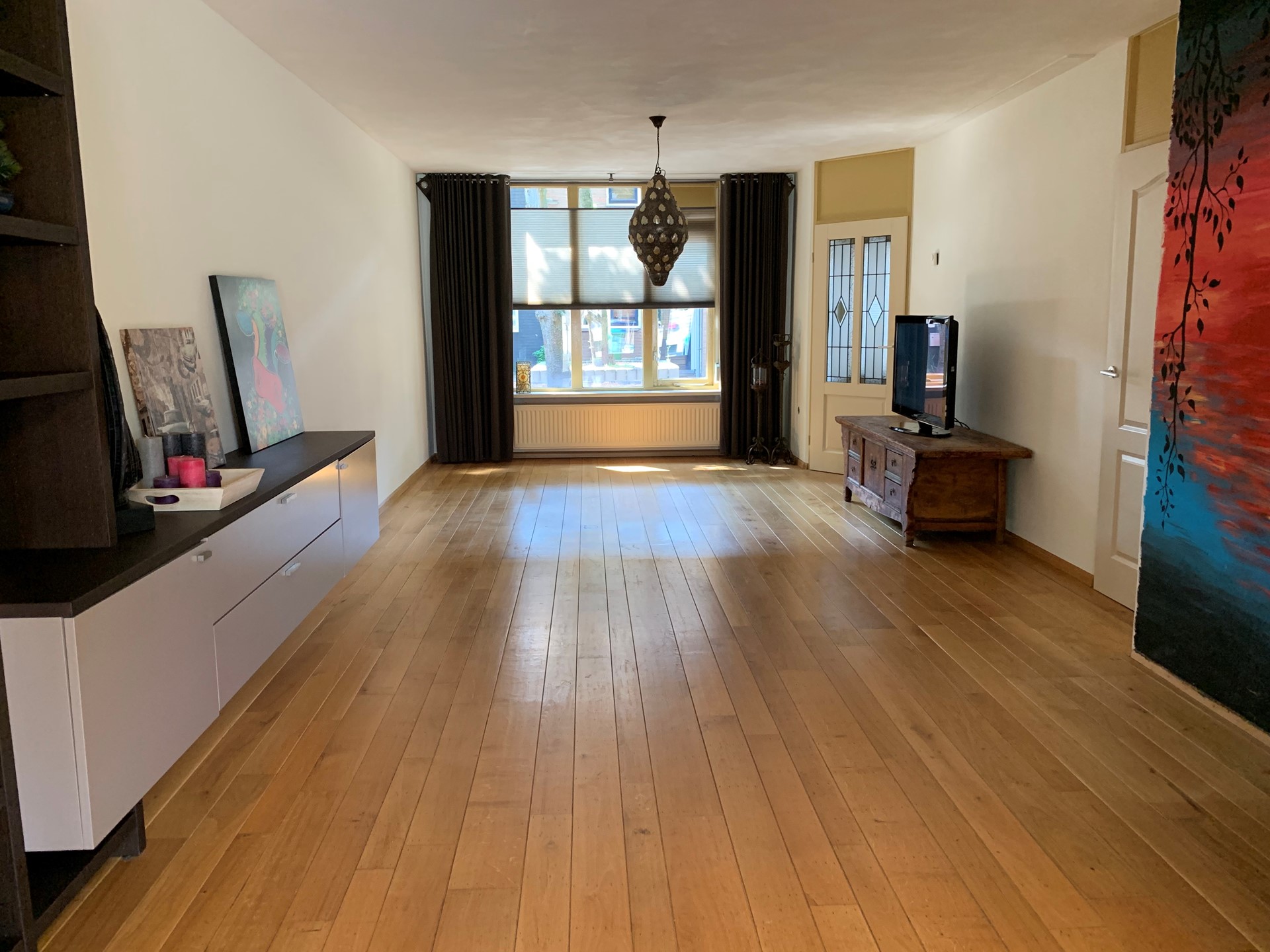 Ruime doorzonwoonkamer (8.50 bij 3.50/3.858 m) met houten vloer en toegang tot de bergkast (1,90 bij 1, 20 m. met wasmachine-aansluiting) en het halletje met trap naar de eerste verdieping.