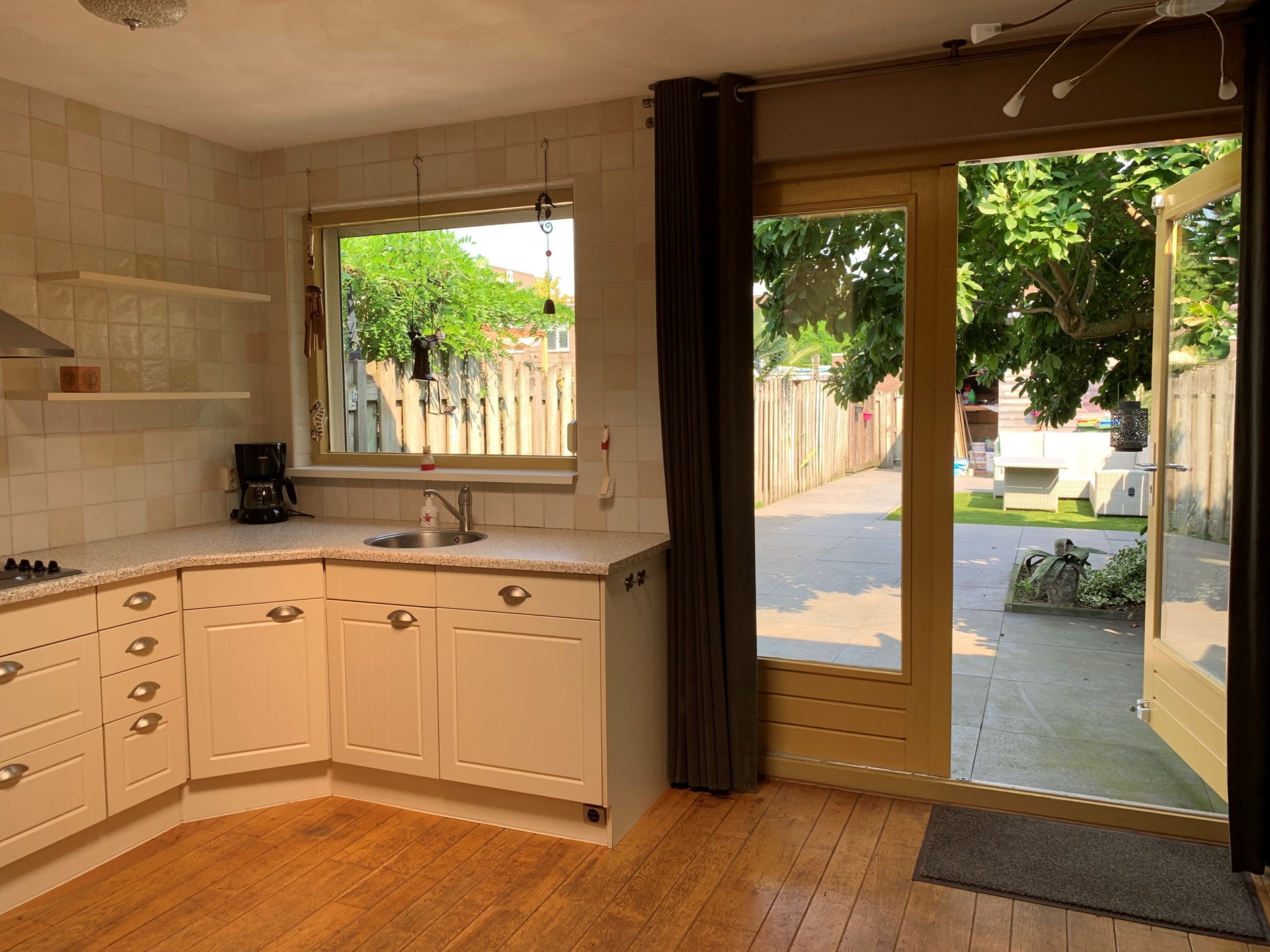 Ruime U-vormige keukenopstelling met de diverse apparatuur, t.w. 4-pits elektrisch fornuis, RVS afzuigkap, vaatwasser, koelkast en vriezer. Door de lichtkoepel is de woonkeuken heerlijk licht. Vanuit de open keuken heeft u –via de openslaande deuren- toegang tot de diepe achtertuin.
