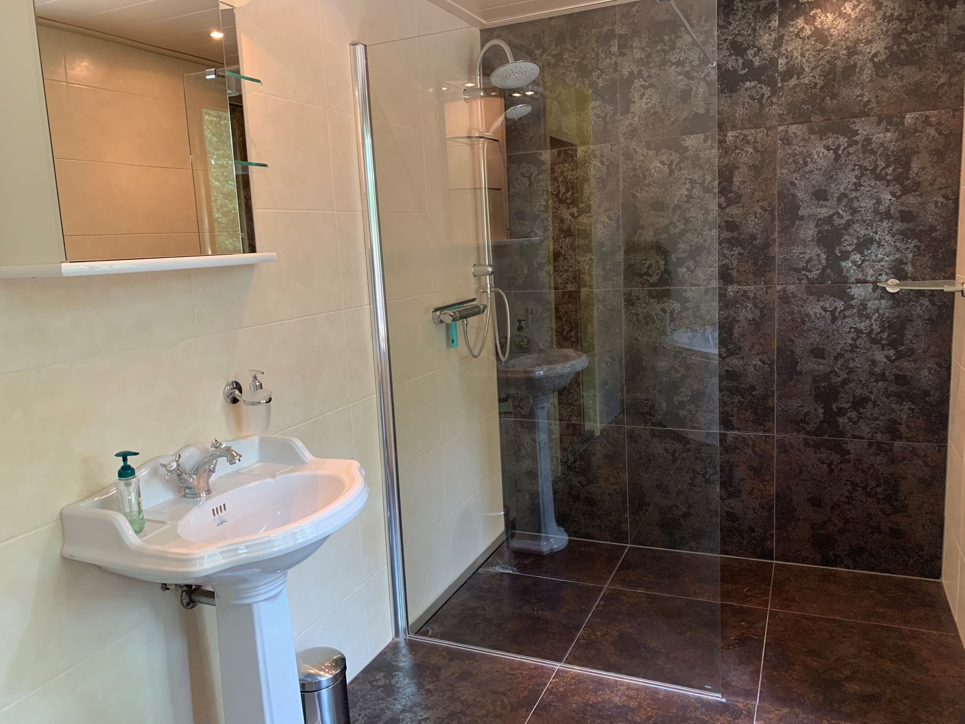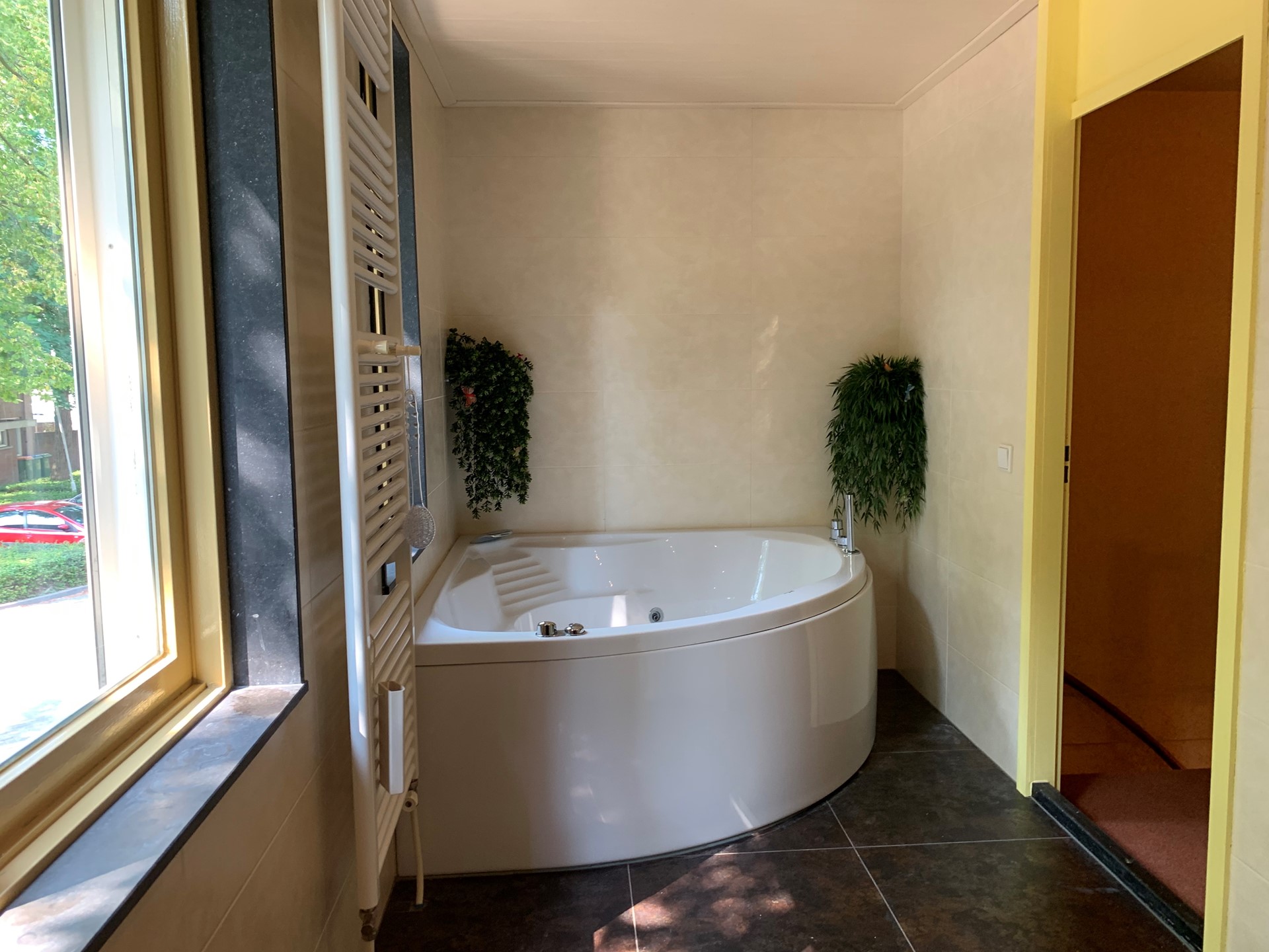 De zeer ruime moderne badkamer (4,85 bij 1,80 m) is voorzien van een inloopdouche met glazen wand, hoekjacuzzi en wastafel.