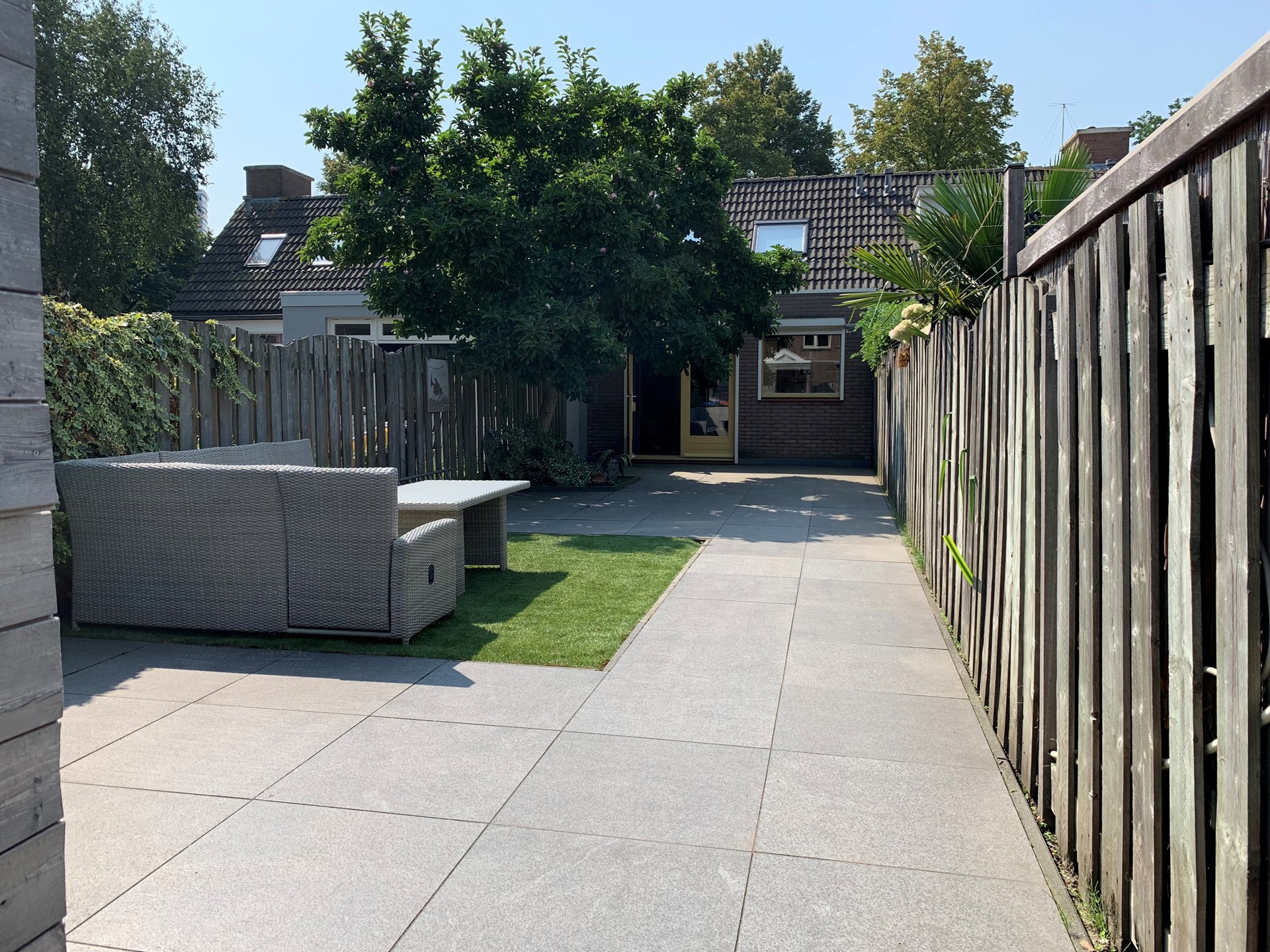 17 m. diepe achtertuin op het zuid, aangelegd met grote tegels, kustgras eenvoudige berging en achteruitgang.