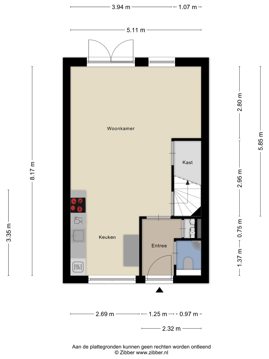 U komt binnen in de entree met meterkast (8 groepen), betegelde toiletruimte met hangend toilet en wastafel. Vanuit de entree heeft u toegang tot de woonkamer.