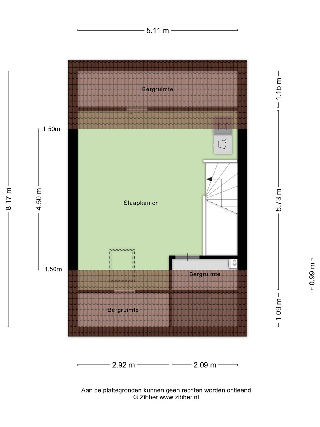 Onder de trap is een inbouwkast (0,97 bij 2,95 m.) met elektra en de verdeler van de verwarming.