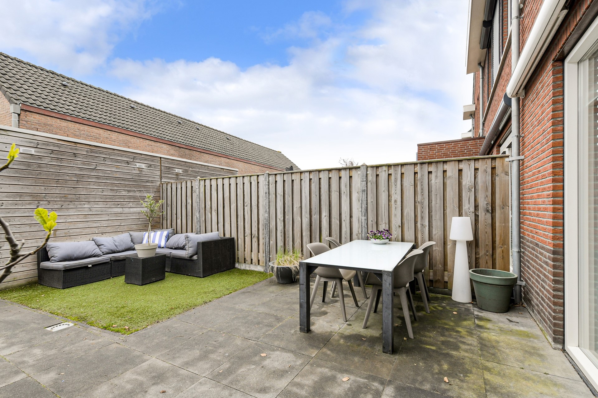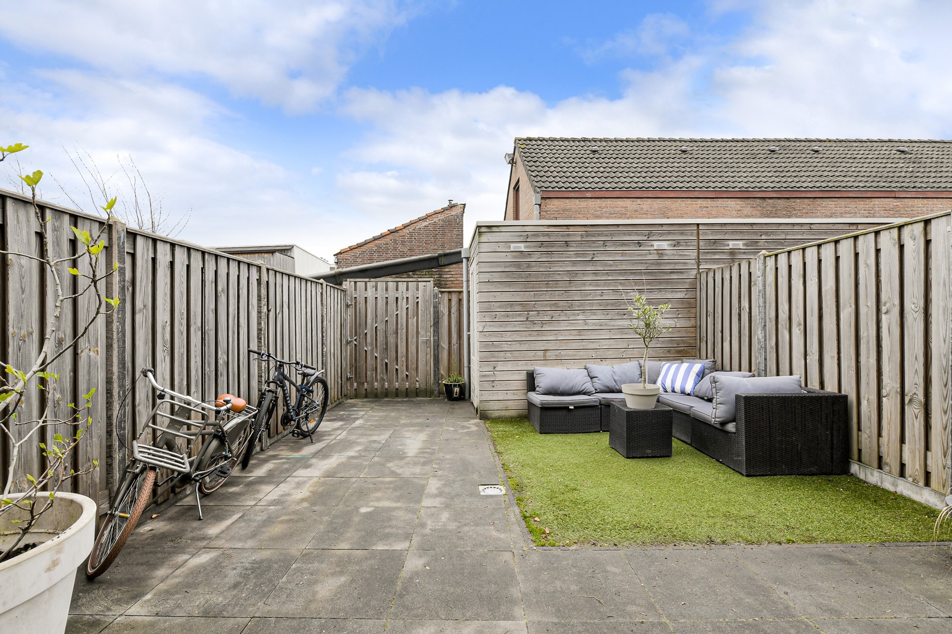 De woning heeft een tuin van 10,55 bij 5,33 m. en is op het noordwesten gesitueerd. Die tuin is voorzien van grote tegels en kunstgras.