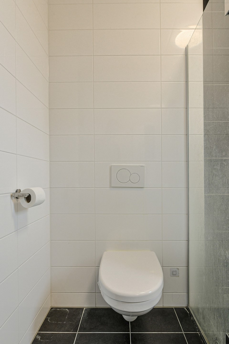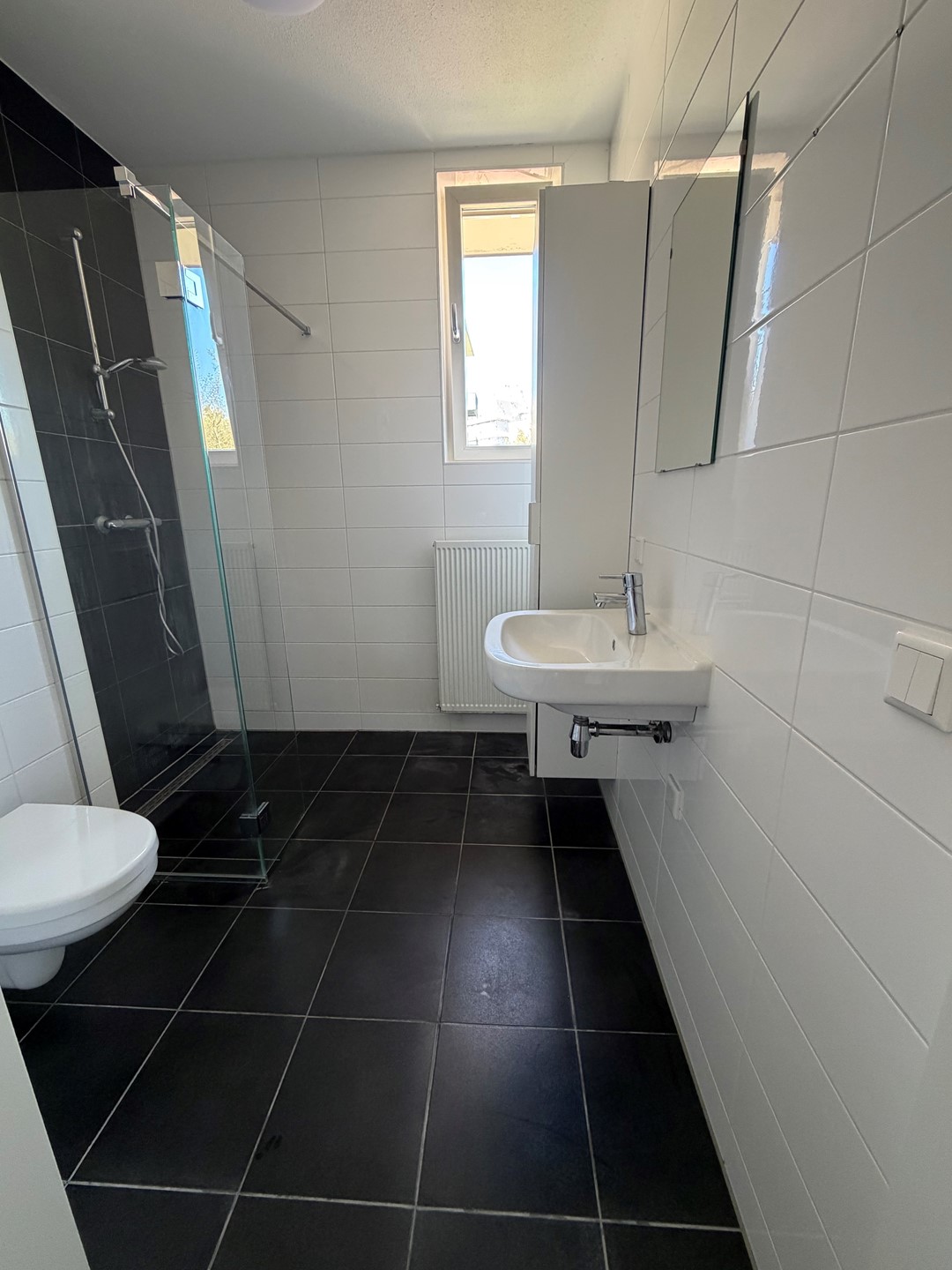De geheel betegelde badkamer (2,07 bij 2,19 m.) beschikt over een inloopdouche met glazen wand, een hangend toilet en wastafel. Naast de mechanische ventilatie kunt u de badkamer ventileren via het raam.
